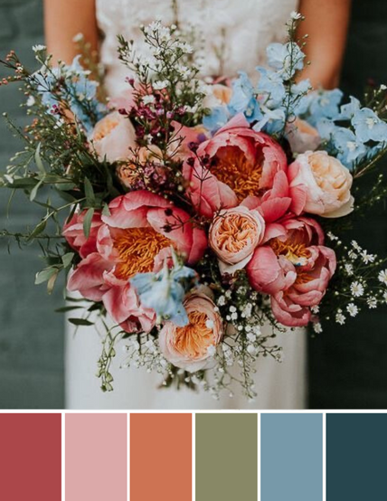 As far as the bouquet goes in the first photo this photo is combination of coral peonies, baby's breath, peach flowers, eucalyptus, and blue delphiniums all that can be grown in the TN area and used for weddings and prepped yourself.